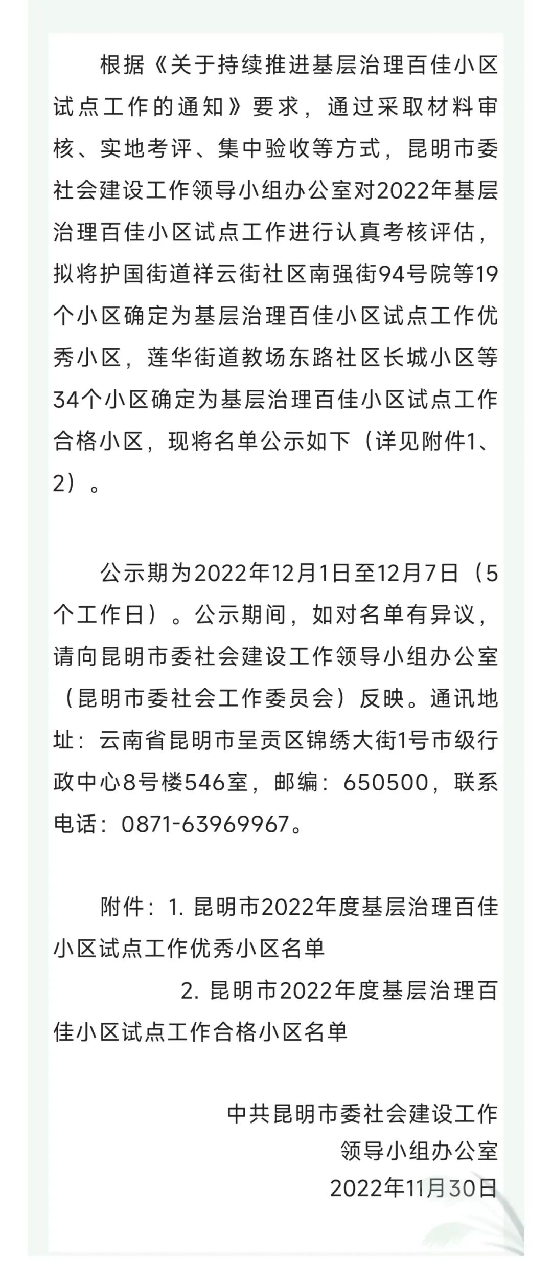 昆明市委社會建設(shè)工作領(lǐng)導(dǎo)小組辦公室通過采取材料審核、實地考評、集中驗收等方式,對2022年基層治理百佳小區(qū)試點工作進行認真考核評估,最終榮獲基層治理百佳小區(qū)試點工作優(yōu)秀小區(qū)19個,合格小區(qū)34個。