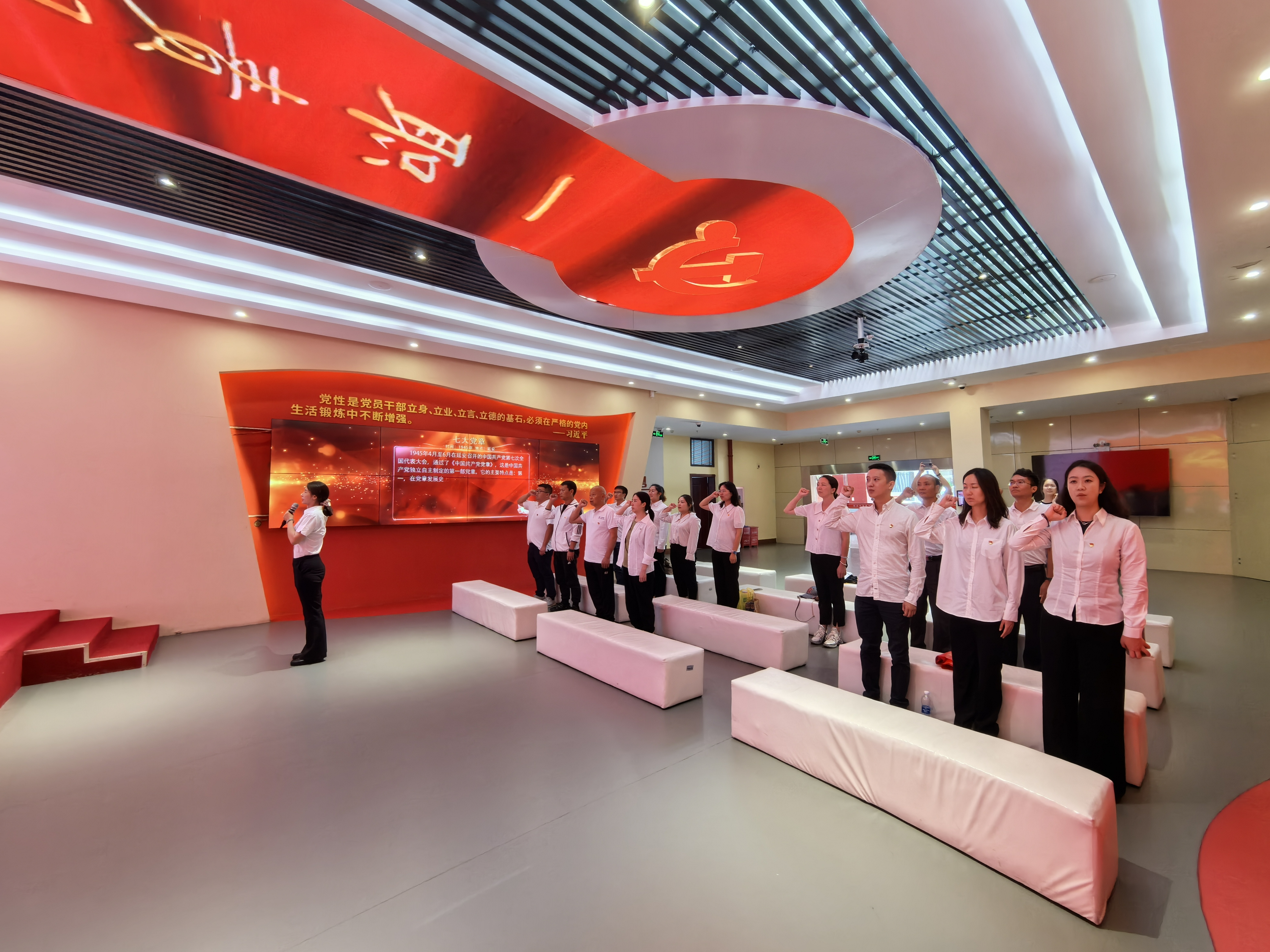 此次活動(dòng)以展廳講解、微黨課、聽紅色故事、唱紅歌、重溫入黨誓詞等環(huán)節(jié)組成。在專業(yè)講解員的引導(dǎo)下,從紅船上的中共一大到新中國(guó)成立、從土地革命到改革開放、從“東方紅”到 C919, 全體黨員通過圖片、視頻及實(shí)景展示深入了解了中國(guó)共產(chǎn)黨從創(chuàng)立發(fā)展中的艱辛歷程和取得的輝煌成就。